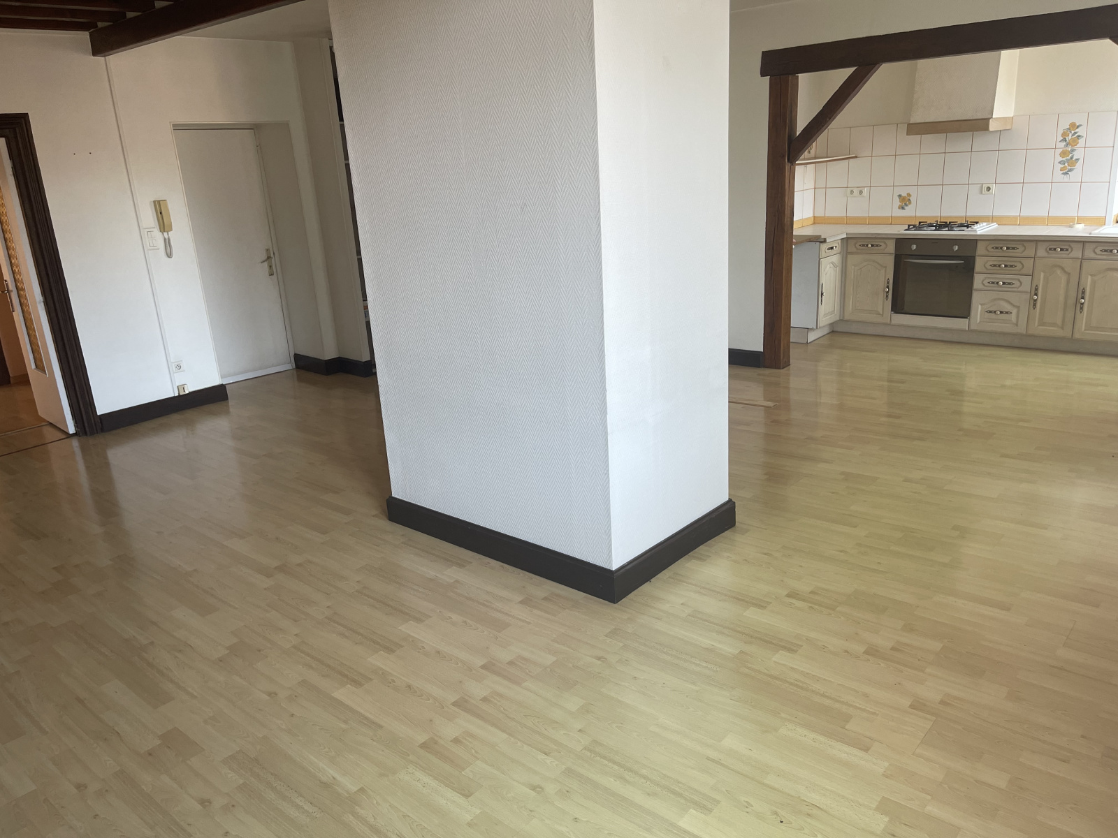 Proche Préfecture appartement T3 Duplex : Entrée avec placards, cuisine équipée (Plaque de cuisson, hotte, four) ouverte sur grande pièce principale, une chambre , salle d'eau, WC.
