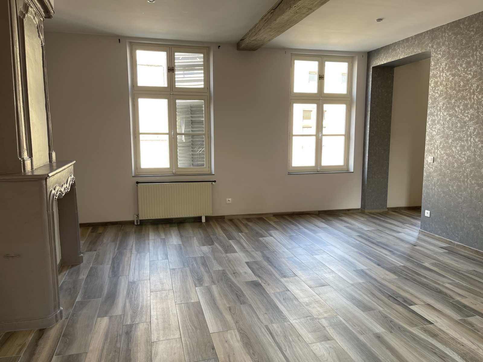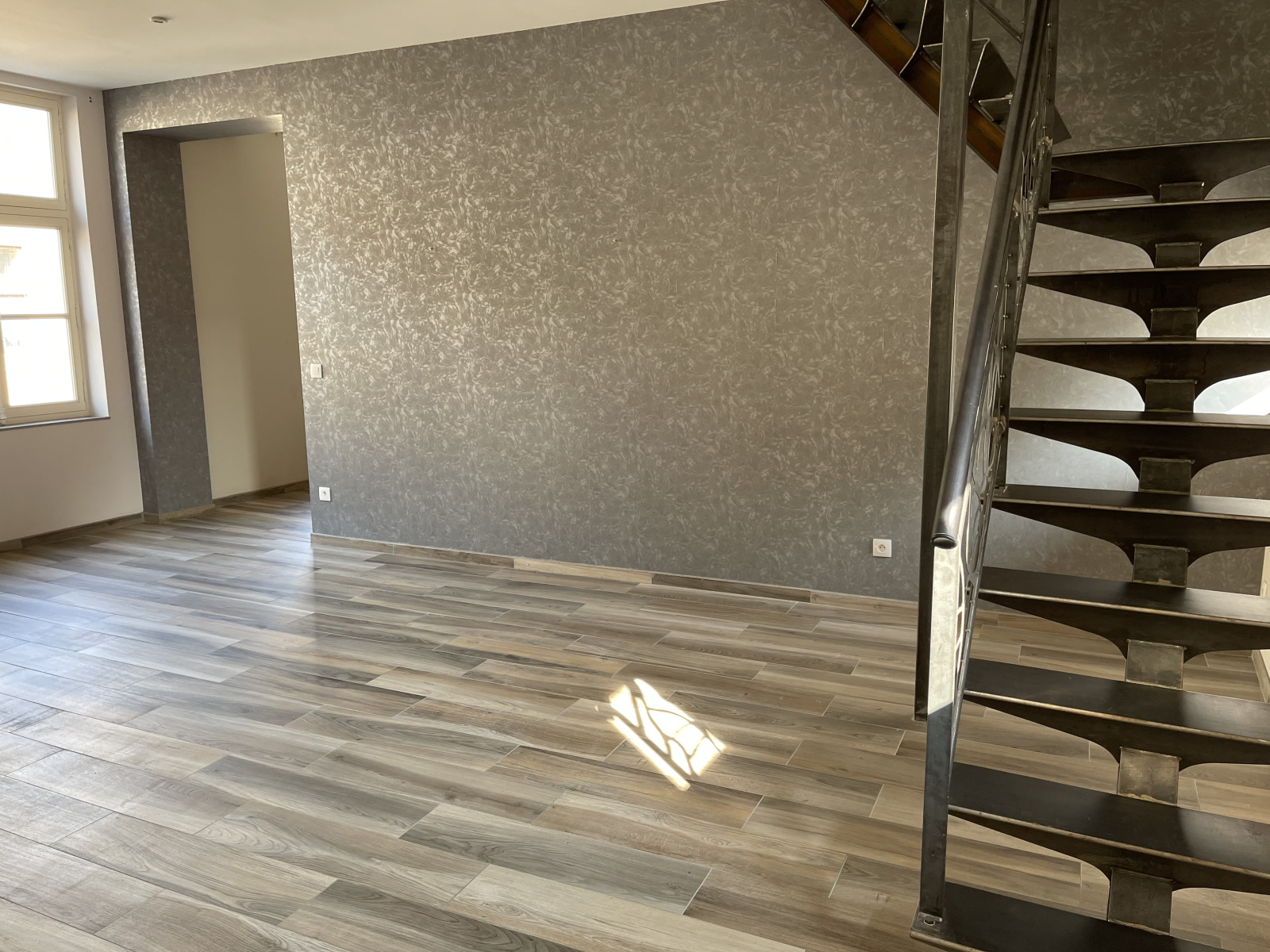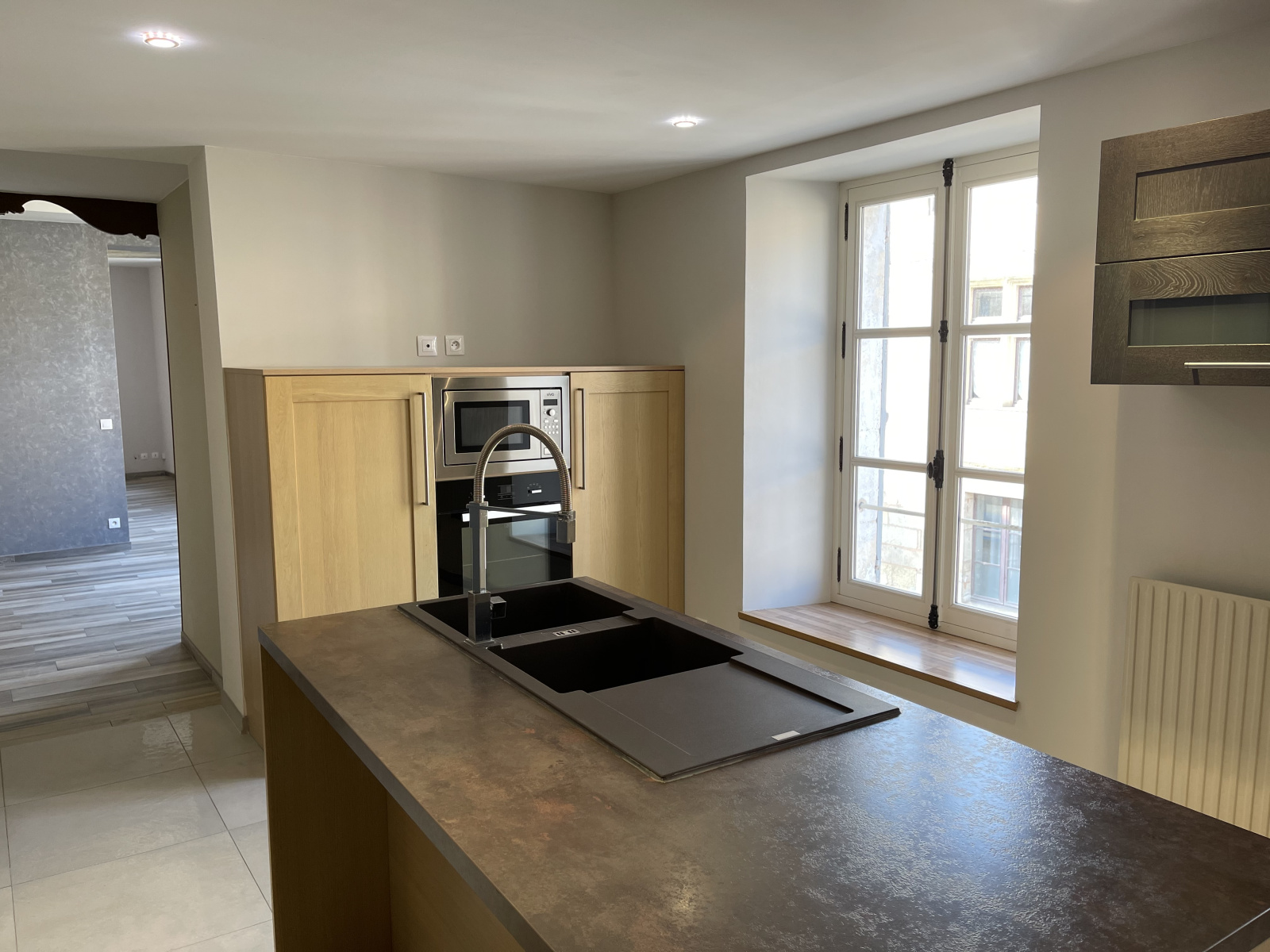Bel Appartement T6 entièrement rénové : Entrée avec placards, Cuisine moderne et équipée (Plaque induction, Hotte, Four, Four micro-ondes) avec coin repas, belle et spacieuse pièce principale, WC.