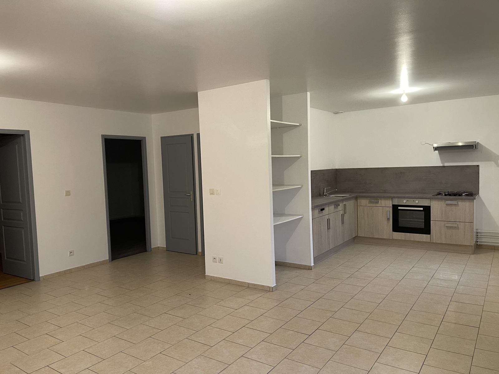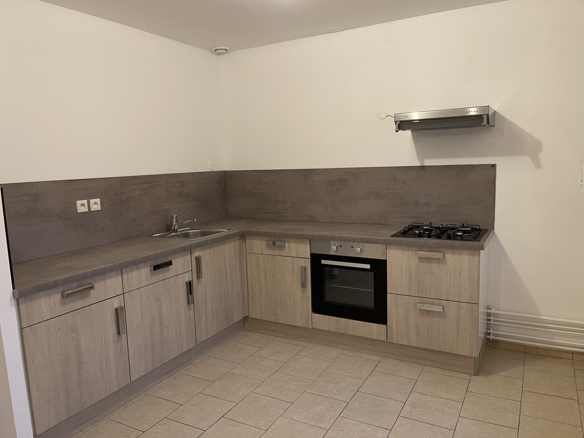 Maison de plain-pied : Cuisine équipée (Plaque de cuisson, hotte, four) ouverte sur belle et spacieuse pièce principale, 2 chambres dont une avec placards, salle d'eau, WC.